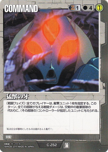 ![]() ![]() | C-Z52 猛獣の牙 COMMAND ドラマチックブースター 乱世に生きる漢たち 色:黒 コスト[指定/合計(資源)]:黒1/4① 特徴:支配 (戦闘フェイズ):全てのプレイヤーは、敵軍ユニット1枚を指定する。このターン、全ての部隊が与える戦闘ダメージは、交戦中の敵軍部隊の代わりに、(その部隊の)コントローラーが指定したユニットに与えられる。 「私は自分が標的にしたものは逃さん主義だ!」 |