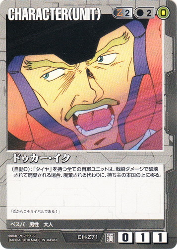 ![]() ![]() | CH-199 ランバ・ラル CHARACTER ドラマチックブースター 乱世に生きる漢たち U 色:緑 セット対象:UNIT コスト[指定/合計(資源)]:緑2/3(0) 格闘力:2 射撃力:0 防御力:2 特徴:ジオン/男性/大人 (自動D):このカードがセットされているユニットが破壊された場合、ゲリラ屋コイン{UNIT、地形適正「地球」、1/1/1}X個を出す。Xの値は、自軍国力の数と同じとする。 「キュイで木馬に突っ込む!」 illust:Tsukasa Dokite |