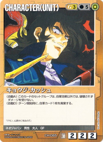 ![]() ![]() | CH-G65 キョウジ・カッシュ CHARACTER ドラマチックブースター 乱世に生きる漢たち 色:茶 セット対象:UNIT コスト[指定/合計(資源)]:茶3/5(0) 格闘力:2 射撃力:2 防御力:2 特徴:ネオジャパン/男性/大人/GF (自動A):このカードのセットグループは、自軍効果以外では、破壊されずダメージを受けない。 (自動D):ターン開始時に、自軍カード1枚を廃棄する。 「ドモン、心静かに死ぬのだ」 illust:Hiroshi Ousaka |