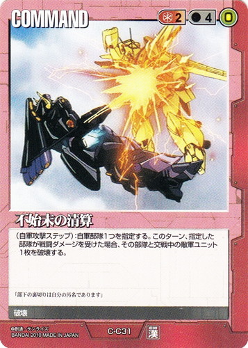 ![]() ![]() | C-C31 不始末の精算 COMMAND ドラマチックブースター 乱世に生きる漢たち 色:赤 コスト[指定/合計(資源)]:赤2/4(0) 特徴:破壊 (自軍攻撃ステップ):自軍部隊1つを指定する。このターン、指定した部隊が戦闘ダメージを受けた場合、その部隊と交戦中の敵軍ユニット1体を破壊する。 「部下の裏切りは自分の汚名であります」 |