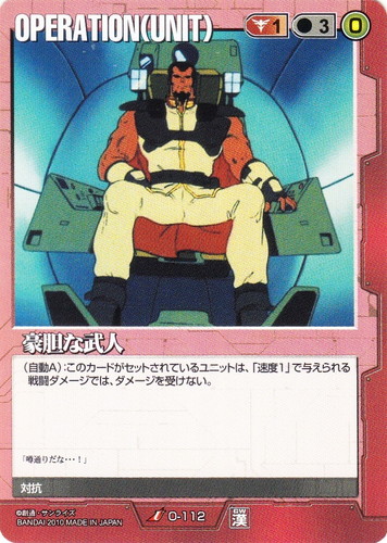![]() ![]() | O-112 豪胆な武人 OPERATION ドラマチックブースター 乱世に生きる漢たち U 色:赤 セット対象:UNIT コスト[指定/合計(資源)]:赤1/3(0) 特徴:対抗 (自動A):このカードがセットされているユニットは、「速度1」で与えられるダメージでは、ダメージを受けない。 「噂通りだな・・・!」 |