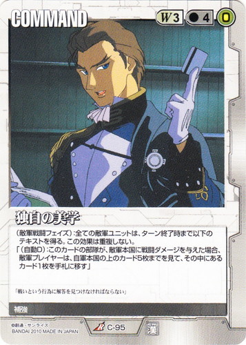 ![]() ![]() | C-95 独自の美学 COMMAND ドラマチックブースター 乱世に生きる漢たち R 色:白 コスト[指定/合計(資源)]:白3/4(0) 特徴:補強 (敵軍戦闘フェイズ):全ての敵軍ユニットは、ターン終了時まで以下のテキストを得る。この効果は重複しない。 「(自動D):このカードの部隊が、敵軍本国に戦闘ダメージを与えた場合、敵軍プレイヤーは、自軍本国の上のカード5枚までを見て、その中にあるカード1枚を手札に移す」 「戦いという行為に解答を見つけなければならない」 |