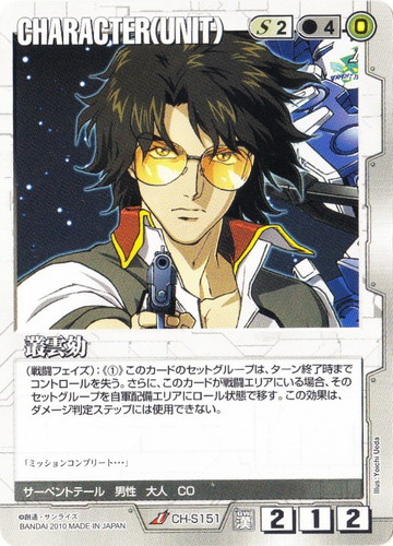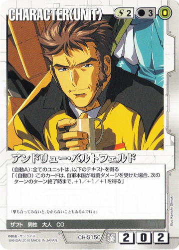 ![]() ![]() | CH-S150 アンドリュー・バルトフェルド CHARACTER ドラマチックブースター 乱世に生きる漢たち 色:白 セット対象:UNIT コスト[指定/合計(資源)]:白2/3(0) 格闘力:2 射撃力:0 防御力:2 特徴:ザフト/男性/大人/CO (自動A):全てのユニットは、以下のテキストを得る 「(自動D):このカードは、自軍本国が戦闘ダメージを受けた場合、次のターンのターン終了時まで、+1/+1/+1を得る」 「撃ち合ってみないと、わからないこともあるんでねぇ」 illust:Kenichi Ohnuki |