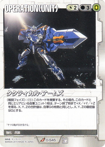 ![]() ![]() | O-S45 タクティカル・アームズ OPERATION ドラマチックブースター 乱世に生きる漢たち U 色:白 セット対象:UNIT コスト[指定/合計(資源)]:白2/3(0) 特徴:強化/兵装 (戦闘フェイズ):《①》このカードを廃棄する。その場合、このカードと同じエリアにいる自軍ユニット1枚は、ターン終了時まで+X/+Y/+Zを得る。X、Y、Zの合計値は、自軍Gの枚数と同じとし、X、Y、Zの最低値は0とする。 「ヤツは俺が引き受ける」 |