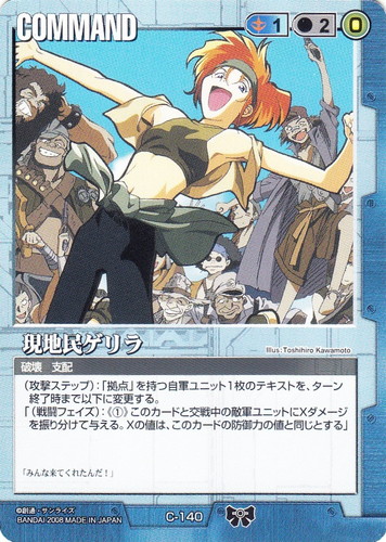 ![]() ![]() | C-140 現地民ゲリラ COMMAND ドラマチックブースター 戦場の女神2 色:青 コスト[指定/合計(資源)]:青1/2(0) 特徴:破壊/支配 (攻撃ステップ):「拠点」を持つ自軍ユニット1枚のテキストを、ターン終了時まで以下に変更する。 「(戦闘フェイズ):《①》このカードと交戦中の敵軍ユニットにXダメージを振り分けて与える。Xの値は、このカードの防御力の値と同じとする」 「みんな来てくれたんだ!」 illust:Toshihiro Kawamoto |
