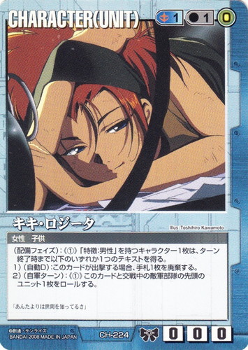 ![]() ![]() | CH-224 キキ・ロジータ CHARACTER ドラマチックブースター 戦場の女神2 色:青 セット対象:UNIT コスト[指定/合計(資源)]:青1/1(0) 格闘力:0 射撃力:0 防御力:0 特徴:女性/子供 (配備フェイズ):《①》「特徴:男性」を持つキャラクター1枚は、ターン終了時まで以下のいずれかのテキストを得る。 1)(自動D):このカードが出撃する場合、手札1枚を廃棄する。 2)(自軍ターン):《①》このカードと交戦中の敵軍部隊の先頭のユニット1枚をロールする。 「あんたよりは世間を知ってるさ」 illust:Toshihiro Kawamoto |