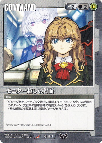 ![]() ![]() | C-OO1 モニター越しの対面 COMMAND ドラマチックブースター 戦場の女神2 U 色:黒 コスト[指定/合計(資源)]:黒2/2(0) (ダメージ判定ステップ):交戦中の戦闘エリア1つにいる全ての部隊は、このターン、交戦中の敵軍部隊に戦闘ダメージを与える代わりに、(その部隊の)敵軍本国に戦闘ダメージを与える。 「いつもモニター越しでないと人と会わないんだよ」 |