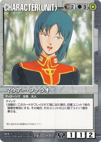 ![]() ![]() | CH-97 マウアー・ファラオ CHARACTER ドラマチックブースター 戦場の女神2 色:黒 セット対象:UNIT コスト[指定/合計(資源)]:黒2/3(0) 格闘力:1 射撃力:1 防御力:2 特徴:ティターンズ/女性/大人 クイック (自動B):このカードがプレイされて場に出た場合、自軍ユニット1枚の破壊を無効にする。その場合、そのユニットの上に魅了コイン1個を乗せる。 「思い詰めるのは危険なのではなくて?」 illust:Hiroyuki Kitazume |