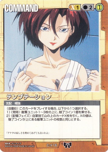 ![]() ![]() | C-X16 テンプテーション COMMAND ドラマチックブースター 戦場の女神2 色:茶 コスト[指定/合計(資源)]:茶1/2① 特徴:支配/補強 (自動B):このカードをプレイする場合、以下から1つ選択する。 1)(常時):敵軍ユニット1~3枚の上に、魅了コイン1個を乗せる。 2)(配備フェイズ):自軍捨て山の上のカードX枚を引く。Xの値は、魅了コインが上にある敵軍ユニットの枚数と同じとする。 「アナタの寂しさを埋めてあげても良いわよ」 |
