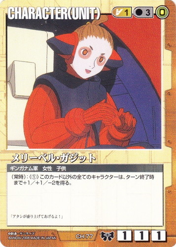![]() ![]() | CH-77 メリーベル・ガジット CHARACTER ドラマチックブースター 戦場の女神2 色:茶 セット対象:UNIT コスト[指定/合計(資源)]:茶1/3(0) 格闘力:1 射撃力:1 防御力:1 特徴:ギンガナム軍/女性/子供 (常時):《①》このカード以外の全てのキャラクターは、ターン終了時まで+1/+1/-2を得る。 「アタシが盛り上げてあげるよ!」 |