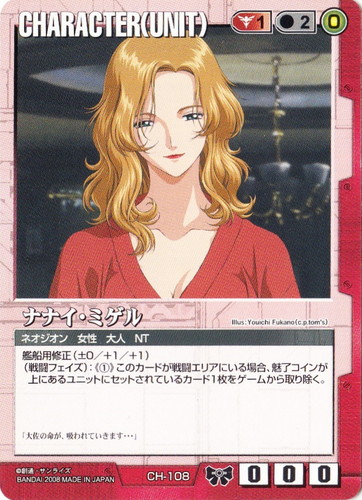 ![]() ![]() | CH-108 ナナイ・ミゲル CHARACTER ドラマチックブースター 戦場の女神2 色:赤 セット対象:UNIT コスト[指定/合計(資源)]:赤1/2(0) 格闘力:0 射撃力:0 防御力:0 特徴:ネオジオン/女性/大人/NT 艦船用修正(±0/+1/+1) (戦闘フェイズ):《①》このカードが戦闘エリアにいる場合、魅了コインが上にあるユニットにセットされているカード1枚をゲームから取り除く。 「大佐の命が、吸われていきます・・・」 illust:Youichi Fukano(c.p.tom’s) |