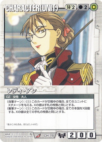 ![]() ![]() | CH-78 レディ・アン CHARACTER ドラマチックブースター 戦場の女神2 U 色:白 セット対象:UNIT コスト[指定/合計(資源)]:白2/2(0) 格闘力:2 射撃力:0 防御力:0 特徴:OZ/女性/大人 (自軍ターン):《①》このカードが交戦中の場合、全てのユニットにXダメージを与える。Xの値は手札の枚数と同じとする。 (敵軍ターン):《①》このカードが交戦中の場合、全ての本国をX回復する。Xの値は全ての手札の枚数と同じとする。 「私のこの行為も、また正しいのだ」 |