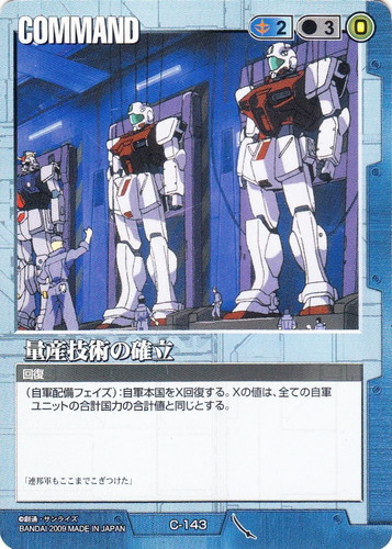 ![]() ![]() | C-143 量産技術の確立 COMMAND 武神降臨 色:青 コスト[指定/合計(資源)]:青2/3(0) 特徴:回復 (自軍配備フェイズ):自軍本国をX回復する。Xの値は、全ての自軍ユニットの合計値と同じとする。 「連邦軍もここまでこぎつけた」 |