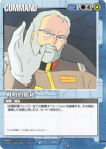 ![]() ![]() | C-144 戦略的勝利 COMMAND 武神降臨 R 色:青 コスト[指定/合計(資源)]:青2/4(0) 特徴:破壊/補強 (自軍配備フェイズ):全ての敵軍オペレーションを破壊する。その場合、破壊した枚数と同じだけ、カード1枚を引く。 「レビル将軍は一言も語らなかったと言う・・・」 |