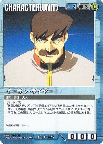 ![]() ![]() | CH-225 イーサン・ライヤー CHARACTER 武神降臨 色:青 セット対象:UNIT コスト[指定/合計(資源)]:青2/3(0) 格闘力:0 射撃力:0 防御力:0 特徴:連邦/男性/大人 【セット/G】 (敵軍防御ステップ):《①》配備エリアにいる自軍ユニット1枚をリロールする。その場合、戦闘エリアにいる敵軍ユニット1枚に、Xダメージを与える。Xの値は、リロールしたユニットの射撃力の値と同じとする。 「病院船を撃墜しろ・・・!」 |