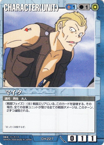 ![]() ![]() | CH-227 マイク CHARACTER 武神降臨 色:青 セット対象:UNIT コスト[指定/合計(資源)]:青1/1(0) 格闘力:0 射撃力:1 防御力:1 特徴:連邦/男性/大人 (戦闘フェイズ):《0》戦闘エリアにいる、このカードを破壊する。その場合、全ての自軍ユニットが受ける全ての戦闘ダメージは、このターン、2ずつ減殺される。 「まったく同情するぜ」 |