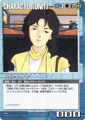 ![]() ![]() | CH-230 ミライ・ノア CHARACTER 武神降臨 色:青 セット対象:UNIT コスト[指定/合計(資源)]:青1/2(0) 格闘力:0 射撃力:0 防御力:0 特徴:女性/大人/NT 別名「ミライ・ヤシマ」 (常時):《R》自軍本国の上のカード5枚を見て、その中にある、「特徴:子供」を持つキャラクター1枚を、このターン中に場に出たユニットにセットできる。その後、自軍本国をシャッフルする。 「この子が行きます」 |
