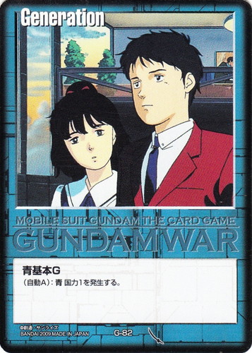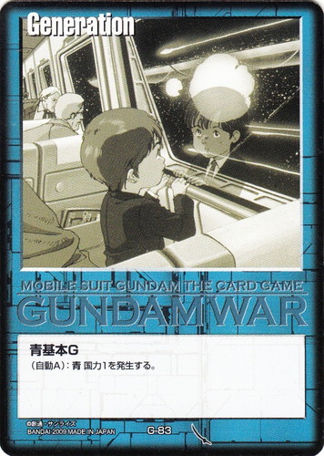 ![]() ![]() | G-84 ホワイトベース隊 Generation 武神降臨 色:青 (自動A):このカードは青国力Xを発生する。さらに敵軍効果では破壊されない。Xの値は、このカードの上のコインの個数+1とする。 (自軍配備フェイズ):《R》手札にある、ユニットとコマンド以外のカード1枚を、表にしてから持ち主の本国の下に移す。その場合、このカードの上にコイン1個を乗せる。この効果のプレイは、Gのプレイとしても扱う。 |