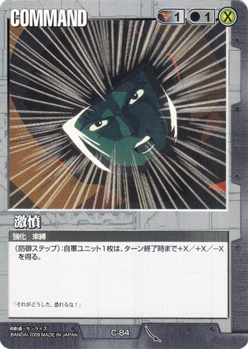 ![]() ![]() | C-84 激憤 COMMAND 武神降臨 色:黒 コスト[指定/合計(資源)]:黒1/1(X) 特徴:強化/束縛 (防御ステップ):自軍ユニット1枚は、ターン終了時まで+X/+X/-Xを得る。 「それがどうした、恐れるな!」 |