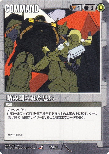 ![]() ![]() | C-86 踏み躙られた思い COMMAND 武神降臨 R 色:黒 コスト[指定/合計(資源)]:黒1/3(0) 特徴:束縛 プリベント(5) (リロールフェイズ):敵軍手札全てを持ち主の本国に移す。ターン終了時に、敵軍プレイヤーは、移した枚数までカードを引く。 「カツ・・・好きよ」 |