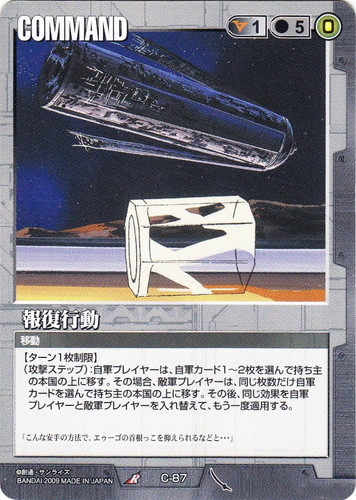![]() ![]() | C-87 報復行動 COMMAND 武神降臨 R 色:黒 コスト[指定/合計(資源)]:黒1/5(0) 特徴:移動 【ターン1枚制限】 (攻撃ステップ):自軍プレイヤーは、自軍カード1~2枚を選んで持ち主の本国の上に移す。その場合、敵軍プレイヤーは、同じ枚数だけジグんカードを選んで持ち主の本国の上に移す。その後、同じ効果を自軍プレイヤーと敵軍プレイヤーを入れ替えて、もう一度適用する。 「こんな安手の方法で、エゥーゴの首根っこを抑えられるなどと・・・」 |