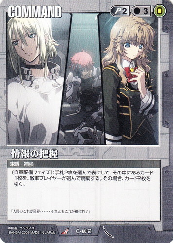 ![]() ![]() | C-OO2 情報の把握 COMMAND 武神降臨 R 色:黒 コスト[指定/合計(資源)]:黒2/3(0) 特徴:束縛/補強 (自軍配備フェイズ):手札2枚を選んで表にして、その中にあるカード1枚を、敵軍プレイヤーが選んで廃棄する。その場合、カード2枚を引く。 「人間のこれが限界・・・・・・それともこれが優位性?」 |