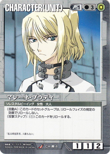 ![]() ![]() | CH-OO4 マレーネ・ブラディ CHARACTER 武神降臨 U 色:黒 セット対象:UNIT コスト[指定/合計(資源)]:黒1/3(0) 格闘力:1 射撃力:1 防御力:2 特徴:ソレスタルビーイング/女性/大人 (自動A):このカードのセットグループは、リロールフェイズの規定の効果でリロールしない。 (攻撃ステップ):《①》このカードをリロールする。 「私は重犯罪者。人権もない」 |