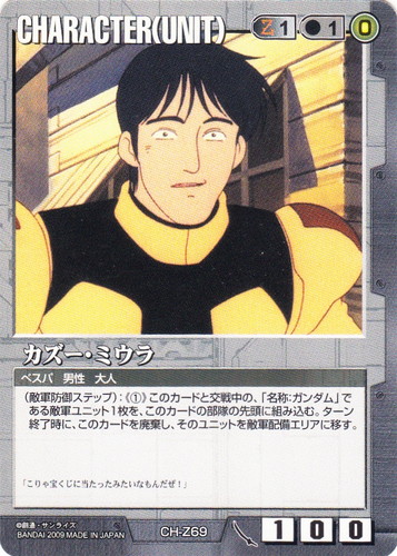![]() ![]() | CH-Z69 カズー・ミウラ CHARACTER 武神降臨 色:黒 セット対象:UNIT コスト[指定/合計(資源)]:黒1/1(0) 格闘力:1 射撃力:0 防御力:0 特徴:ベスパ/男性/大人 (敵軍防御ステップ):《①》このカードと交戦中の、「名称:ガンダム」である敵軍ユニット1枚を、このカードの部隊の先頭に組み込む。ターン終了時に、このカードを廃棄し、そのユニットを敵軍配備エリアに移す。 「こりゃ宝くじに当たったみたいなもんだぜ!」 |