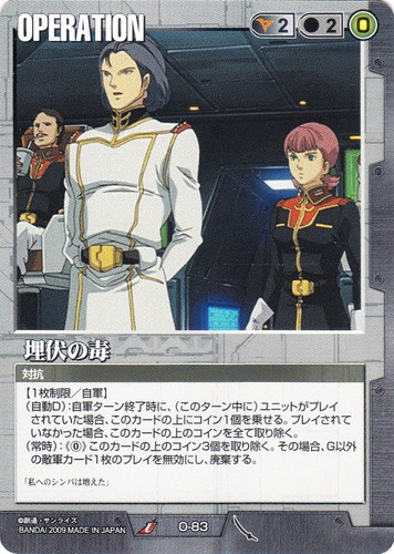 ![]() ![]() | O-83 埋伏の毒 OPERATION 武神降臨 U 色:黒 コスト[指定/合計(資源)]:黒2/2(0) 特徴:対抗 【1枚制限/自軍】 (自動D):自軍ターン終了時に、(このターン中に)ユニットがプレイされていた場合、このカードの上にコイン1個を乗せる。プレイされていなかった場合、このカードの上のコインを全て取り除く。 (常時):《0》このカードの上のコイン3個を取り除く。その場合、G以外の敵軍カード1枚のプレイを無効にし、廃棄する。 「私へのシンパは増えた」 |