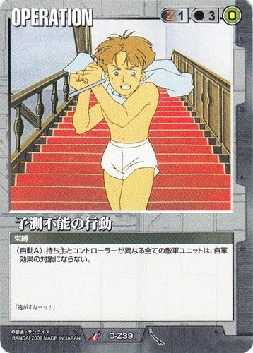![]() ![]() | O-Z39 予測不能の行動 OPERATION 武神降臨 U 色:黒 コスト[指定/合計(資源)]:黒1/3(0) 特徴:束縛 (自動A):持ち主とコントローラーが異なる全ての敵軍ユニットは、自軍効果の対象にならない。 「逃がすなーっ!」 |