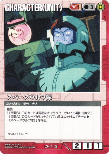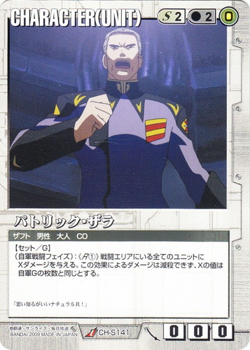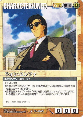 ![]() ![]() | CH-G48 チャン CHARACTER 武神降臨 色:茶 セット対象:UNIT コスト[指定/合計(資源)]:茶1/1(0) 格闘力:-1 射撃力:0 防御力:0 特徴:ネオホンコン/男性/子供 (自動B):このカードは敵軍ユニットにもセットできる。 (自動B):このカードは、場以外の場所にある場合、「特徴:GF」を得る。 「よぉし、これでガンダムは俺の物だ!」 |