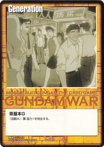 ![]() ![]() | G-G17 茶基本G Generation 武神降臨 色:茶 (自動A):茶国力1を発生する。 |