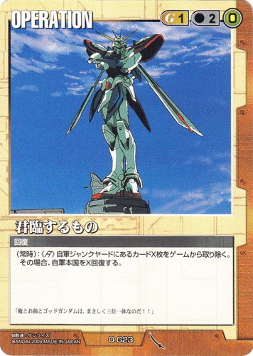 ![]() ![]() | O-G23 君臨するもの OPERATION 武神降臨 色:茶 コスト[指定/合計(資源)]:茶1/2(0) 特徴:回復 (常時):《R》自軍ジャンクヤードにあるカードX枚をゲームから取り除く。その場合、自軍本国をX回復する。 「俺とお前とゴッドガンダムは、まさしく三位一体なのだ!!」 |