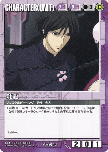 ![]() ![]() | CH-OO12 紅龍 CHARACTER 武神降臨 色:紫 セット対象:UNIT コスト[指定/合計(資源)]:紫1紫1/3(0) 格闘力:2 射撃力:0 防御力:1 特徴:ソレスタルビーイング/男性/大人 (自動D):このカードが交戦中となった場合、配備エリアにある「特徴:女性」を持つキャラクター1枚を、持ち主の手札に移す事ができる。 「お嬢様・・・」 |