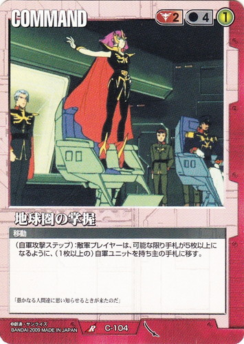 ![]() ![]() | C-104 地球圏の掌握 COMMAND 武神降臨 R 色:赤 コスト[指定/合計(資源)]:赤2/4① 特徴:移動 (自軍攻撃ステップ):敵軍プレイヤーは、可能な限り手札が5枚以上になるように、(1枚以上の)自軍ユニットを持ち主の手札に移す。 「愚かなる人間達に思い知らせるときが来たのだ」 |