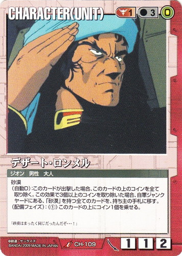 ![]() ![]() | CH-109 デザート・ロンメル CHARACTER 武神降臨 U 色:赤 セット対象:UNIT コスト[指定/合計(資源)]:赤1/3(0) 格闘力:1 射撃力:1 防御力:2 特徴:ジオン/男性/大人 砂漠 (自動D):このカードが出撃した場合、このカードの上のコインを全て取り除く。この効果で3個以上のコインを取り除いた場合、自軍ジャンクヤードにある、「砂漠」を持つ全てのカードを、持ち主の手札に移す。 (配備フェイズ):《①》このカードの上にコイン1個を乗せる。 「砂漠はまったく同じだったんだぞ・・・!」 |
