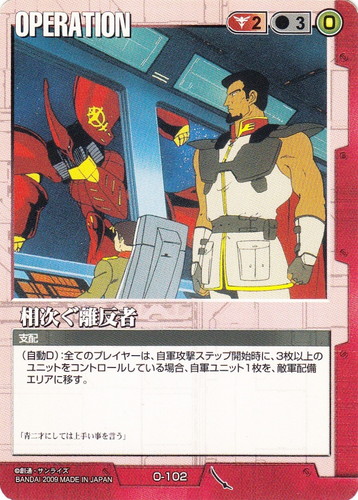 ![]() ![]() | O-102 相次ぐ離反者 OPERATION 武神降臨 色:赤 コスト[指定/合計(資源)]:赤2/3(0) 特徴:支配 (自動D):全てのプレイヤーは、自軍攻撃ステップ開始時に、3枚以上のユニットをコントロールしている場合、自軍ユニット1枚を、敵軍配備エリアに移す。 「青二才にしては上手い事を言う」 |