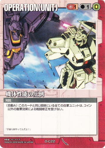 ![]() ![]() | O-C22 機体性能の圧倒 OPERATION 武神降臨 色:赤 セット対象:UNIT コスト[指定/合計(資源)]:赤1/1(0) 特徴:対抗 (自動A):このカードと同じ部隊にいる全ての自軍ユニットは、コイン以外の敵軍効果による戦闘修正を受けない。 「手前ら何やってんだよ!」 |