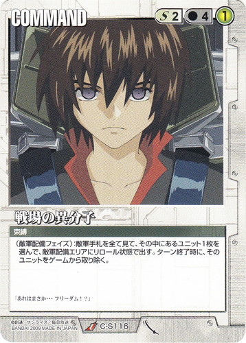 ![]() ![]() | C-S116 戦場の異分子 COMMAND 武神降臨 U 色:白 コスト[指定/合計(資源)]:白2/4① 特徴:束縛 (敵軍配備フェイズ):敵軍手札を全て見て、その中にあるユニット1枚を選んで、敵軍配備エリアにリロール状態で出す。ターン終了時に、そのユニットをゲームから取り除く。 「あれはまさか・・・フリーダム!?」 |