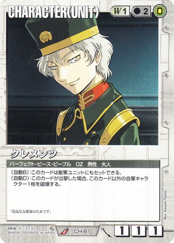 ![]() ![]() | CH-81 クレメンツ CHARACTER 武神降臨 U 色:白 セット対象:UNIT コスト[指定/合計(資源)]:白1/2(0) 格闘力:1 射撃力:1 防御力:1 特徴:パーフェクト・ピース・ピープル/OZ/男性/大人 (自動B):このカードは敵軍ユニットにもセットできる。 (自動D):このカードが出撃した場合、このカード以外の自軍キャラクター1枚を破壊する。 「崇高なる使命のためです」 |