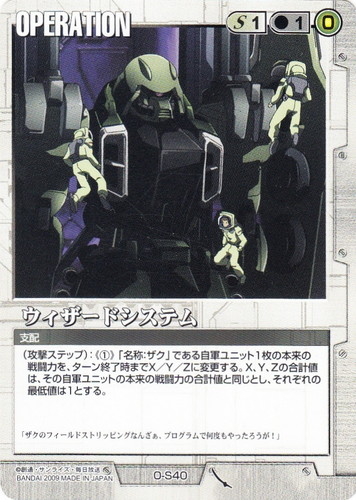 ![]() ![]() | O-S40 ウィザードシステム OPERATION 武神降臨 色:白 コスト[指定/合計(資源)]:白1/1(0) 特徴:支配 (攻撃ステップ):《①》「名称:ザク」である自軍ユニット1枚の本来の戦闘力を、ターン終了時までX/Y/Zに変更する。X、Y、Zの合計値は、その自軍ユニットの本来の戦闘力の合計値と同じとし、それぞれの最低値は1とする。 「ザクのフィールドストリッピングなんざぁ、プログラムで何度もやったろうが!」 |