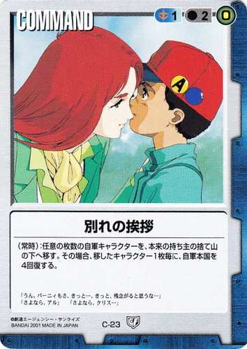 ![]() ![]() | C-23 別れの挨拶 COMMAND 永久の絆 色:青 コスト[指定/合計(資源)]:青1/2(0) (常時):任意の枚数の自軍キャラクターを、本来の持ち主の捨て山の下へ移す。その場合、移したキャラクター1枚毎に、自軍本国を4回復する。 「うん。バーニィもさ、きっと・・・、きっと、残念がると思うな・・・」 「さよなら、アル」「さよなら、クリス・・・」 |