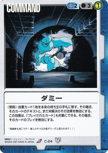 ![]() ![]() | C-24 ダミー COMMAND 永久の絆 U 色:青 コスト[指定/合計(資源)]:青2/3① (常時):自軍カード1枚を本来の持ち主の手札に移す。その場合、そのカードのテキストと、まだ未解決のその効果を無効にする。この効果は、「プレイされたカード」も対象にできる。その場合、そのカードのプレイを無効にする。 「格納庫も同じです!地上のヤツは全部ダミーだと思われます!!」 |