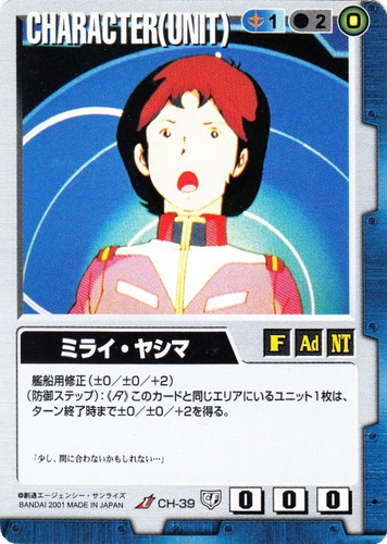 ![]() ![]() | CH-39 ミライ・ヤシマ CHARACTER 永久の絆 U 色:青 セット対象:UNIT コスト[指定/合計(資源)]:青1/2(0) 格闘力:0 射撃力:0 防御力:0 特徴:女性/大人/NT 艦船用修正(±0/±0/+2) (防御ステップ):《R》このカードと同じエリアにいるユニット1枚は、ターン終了時まで±0/±0/+2を得る。 「少し、間に合わないかもしれない・・・」 |