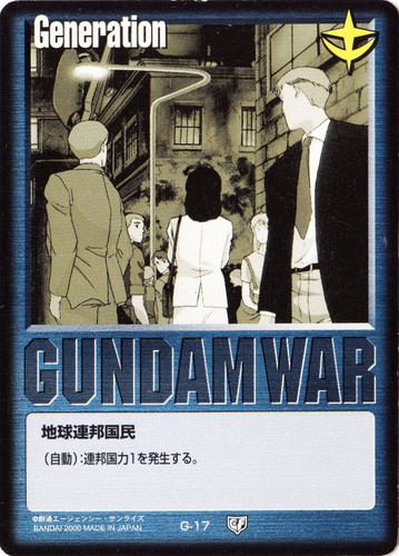 ![]() ![]() | G-17 地球連邦国民 Generation 永久の絆 色:青 (自動):連邦国力1を発生する。 |