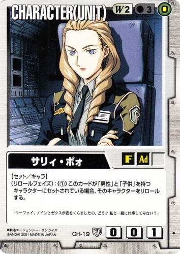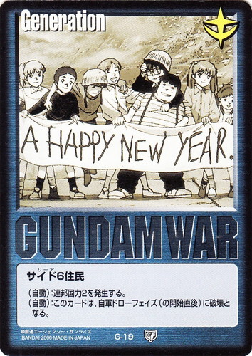 ![]() ![]() | G-19 サイド6住民 Generation 永久の絆 色:青 (自動):連邦国力2を発生する。 (自動):このカードは、自軍ドローフェイズ(の開始直後)に破壊となる。 |