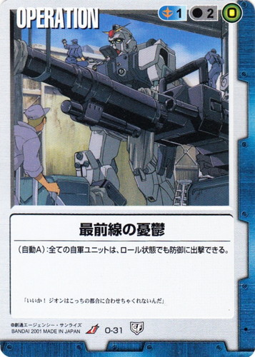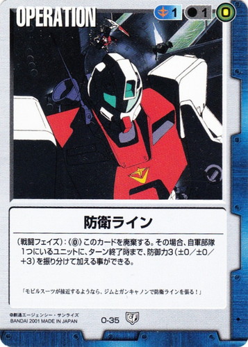 ![]() ![]() | O-35 防衛ライン OPERATION 永久の絆 色:青 コスト[指定/合計(資源)]:青1/1(0) (戦闘フェイズ):《0》このカードを廃棄する。その場合、自軍部隊1つにいるユニットに、ターン終了時まで、防御力3(±0/±0/+3)を振り分けて加える事ができる。 「モビルスーツが接近するようなら、ジムとガンキャノンで防衛ラインを張る!」 |