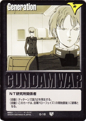 ![]() ![]() | G-16 NT研究所関係者 Generation 永久の絆 色:黒 (自動):ティターンズ国力2を発生する。 (自動):このカードは、自軍ドローフェイズ(の開始直後)に破壊となる。 |
