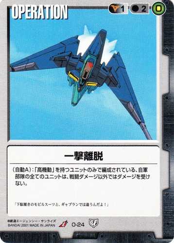 ![]() ![]() | O-24 一撃離脱 OPERATION 永久の絆 U 色:黒 コスト[指定/合計(資源)]:黒1/2(0) (自動A):「高機動」を持つユニットのみで編成されている、自軍部隊全てのユニットは、戦闘ダメージ以外ではダメージを受けない。 「下駄履きのモビルスーツと、ギャプランでは違うんだよ!」 |