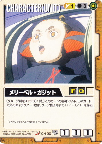 ![]() ![]() | CH-20 メリーベル・ガジット CHARACTER 永久の絆 U 色:茶 セット対象:UNIT コスト[指定/合計(資源)]:茶1/3(0) 格闘力:1 射撃力:1 防御力:1 特徴:女性/子供 (ダメージ判定ステップ):《①》このカードの部隊にいる、このカード以外のキャラクター1枚は、ターん終了時まで+1/+1/+1を得る。 「アハハ、できるんじゃないか!ギンガナム」 |